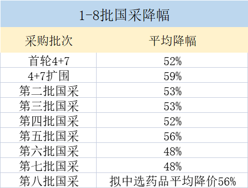 首輪4+7(25個(gè))、第二批國采(32個(gè))、第三批國采(55個(gè))、第四批國采(45個(gè))、第五批國采(61個(gè))、第六批國采(16個(gè))、第七批(60個(gè))、第八批(39個(gè))。