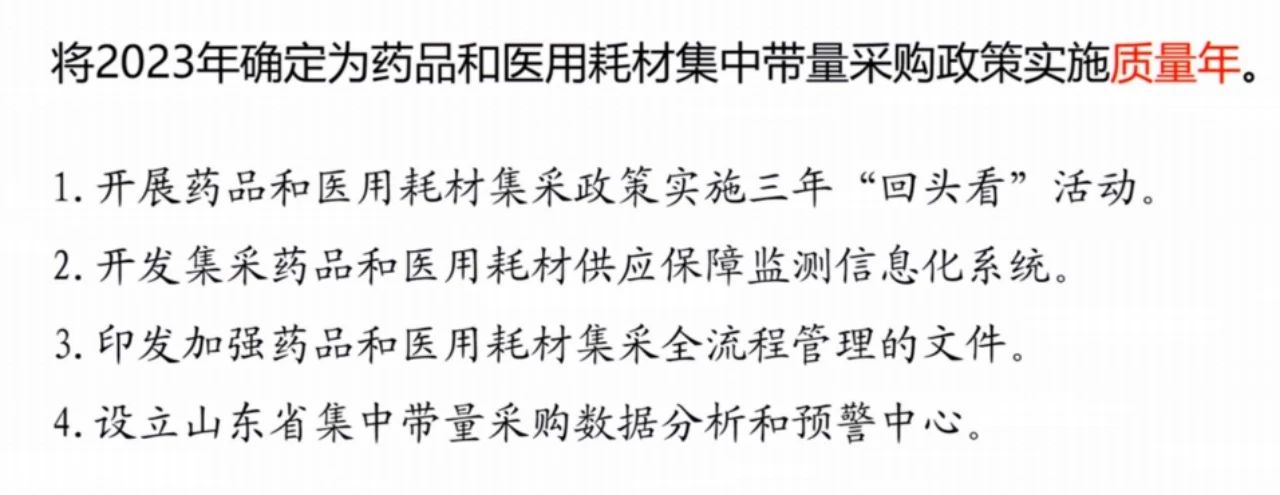 很多省、市開始陸續(xù)發(fā)出“持續(xù)跟進(jìn)藥品耗材集中帶量采購政策落地”,“鞏固提升藥品耗材集中帶量采購政策效果”等相關(guān)號召,山東省更是公開發(fā)布了《關(guān)于加強藥品和醫(yī)用耗材集中帶量采購全流程管理的通知》,將2023年確定為“藥品和醫(yī)用耗材帶量采購政策實施質(zhì)量年”,開展集采政策實施三年“回頭看”行動。