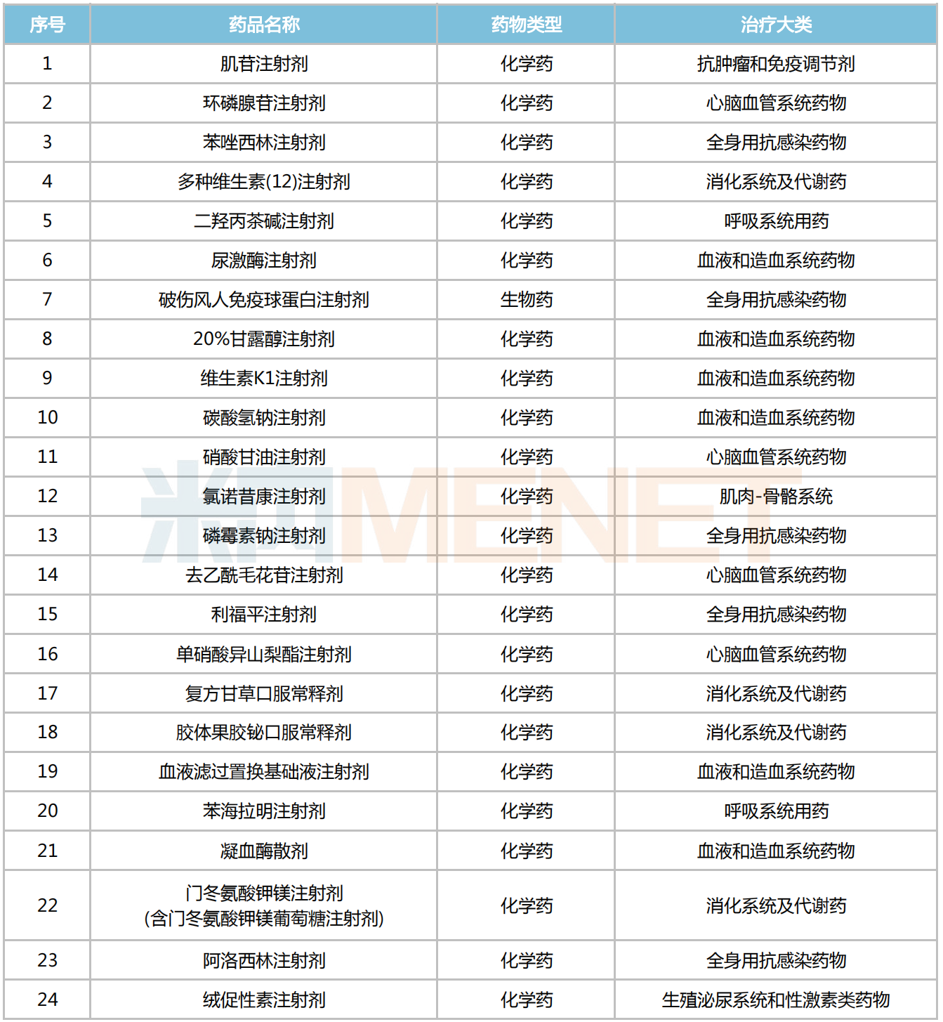 從治療大類看,血液和造血系統(tǒng)藥物為主力,有6個(gè)品種入圍;全身用抗感染藥物(5個(gè))、消化系統(tǒng)及代謝藥(4個(gè))和心腦血管系統(tǒng)藥物(4個(gè))、呼吸系統(tǒng)用藥(2個(gè))緊隨其后;肌肉-骨骼系統(tǒng)用藥、抗腫瘤和免疫調(diào)節(jié)劑、以及生殖泌尿系統(tǒng)和性激素類藥物則各有1個(gè)。