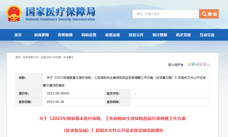 6月28日,國(guó)家醫(yī)保局官網(wǎng)發(fā)布關(guān)于《2023年國(guó)家基本醫(yī)療保險(xiǎn)、工傷保險(xiǎn)和生育保險(xiǎn)藥品目錄調(diào)整工作方案(征求意見(jiàn)稿)》及相關(guān)文件公開(kāi)征求意見(jiàn)情況的通告,國(guó)家醫(yī)保局在6月9日至6月15日在官網(wǎng)向社會(huì)公開(kāi)征求意見(jiàn)建議。期間,國(guó)家醫(yī)保局共收到137條建議。