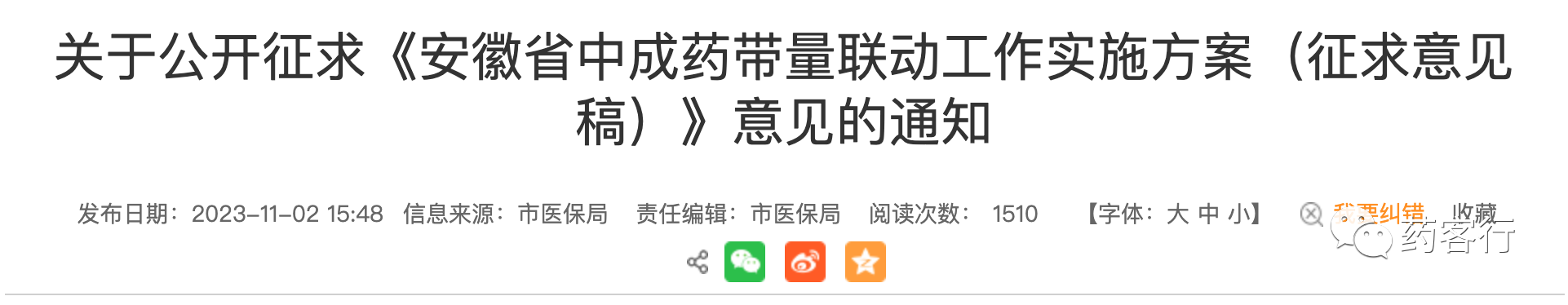 今日,安徽省發(fā)布《安徽省中成藥帶量聯(lián)動工作實施方案(征求意見稿)》,意見反饋截止請于2023年11月8日17:00。以下稱《征求意見稿》。