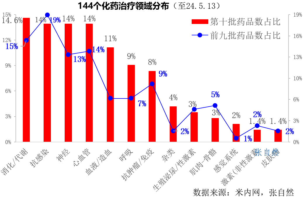 這144個化藥涉及的治療領(lǐng)域在排名上與前九批的有較大差異。