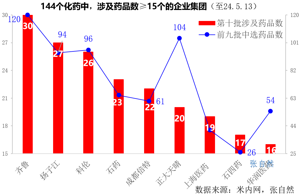 這144個化藥中,涉及藥品數(shù)≥15個的共有9家企業(yè)(按企業(yè)集團計)。