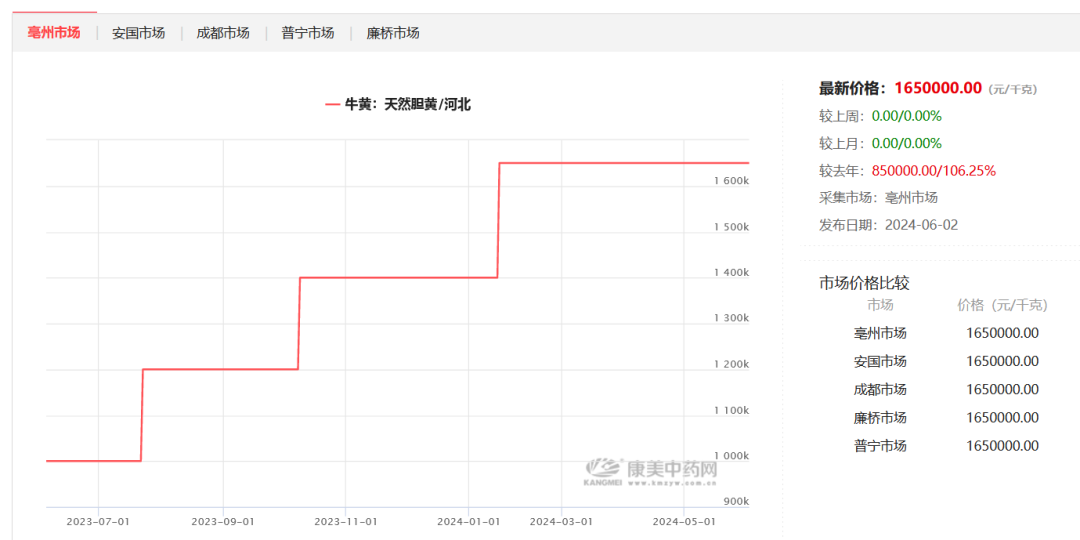 部分中藥材漲價的勢頭仍在,截至目前,根據(jù)康美中藥網(wǎng)的消息,亳州、安國等多個市場天然牛黃的價格在165萬元/公斤。