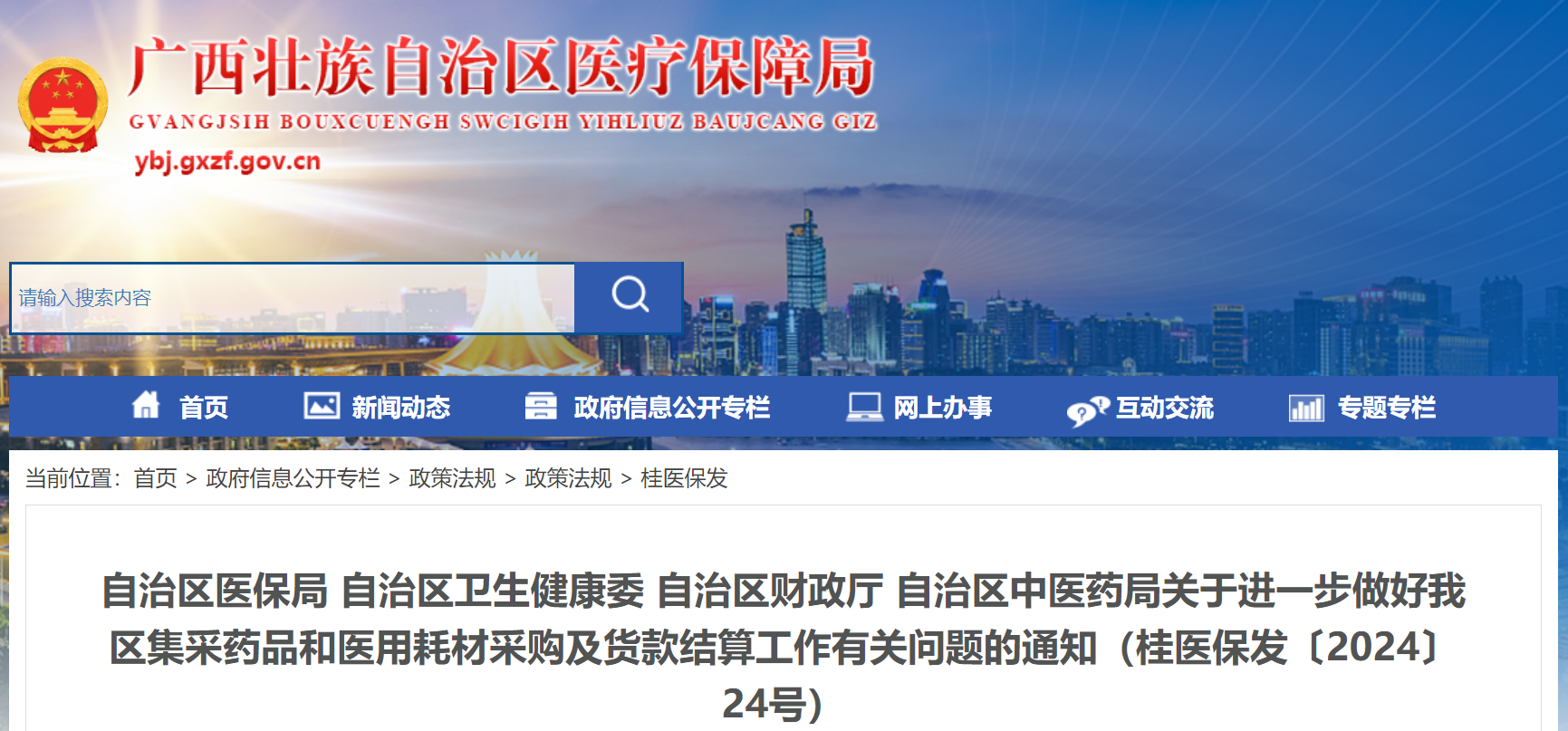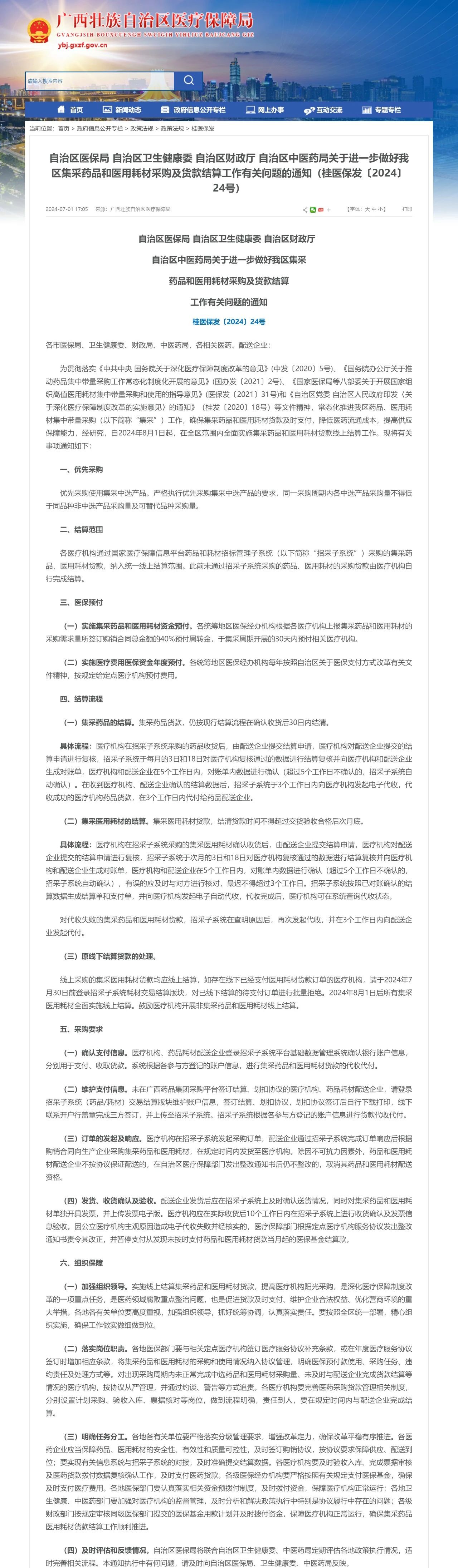 根據(jù)《通知》,廣西自2024年8月1日起,將在全區(qū)范圍內(nèi)全面實(shí)施集采藥品和醫(yī)用耗材貨款線上結(jié)算工作。