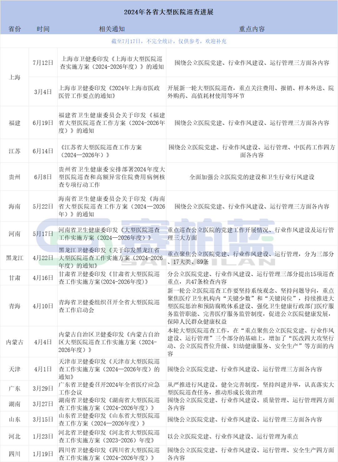 截至7月17日,據賽柏藍不完全統(tǒng)計,上海、福建、江蘇、貴州、海南、河南、黑龍江、甘肅、青海、內蒙古、天津、廣東、湖南、山東、河北、四川均已發(fā)布大型醫(yī)院巡查方案。