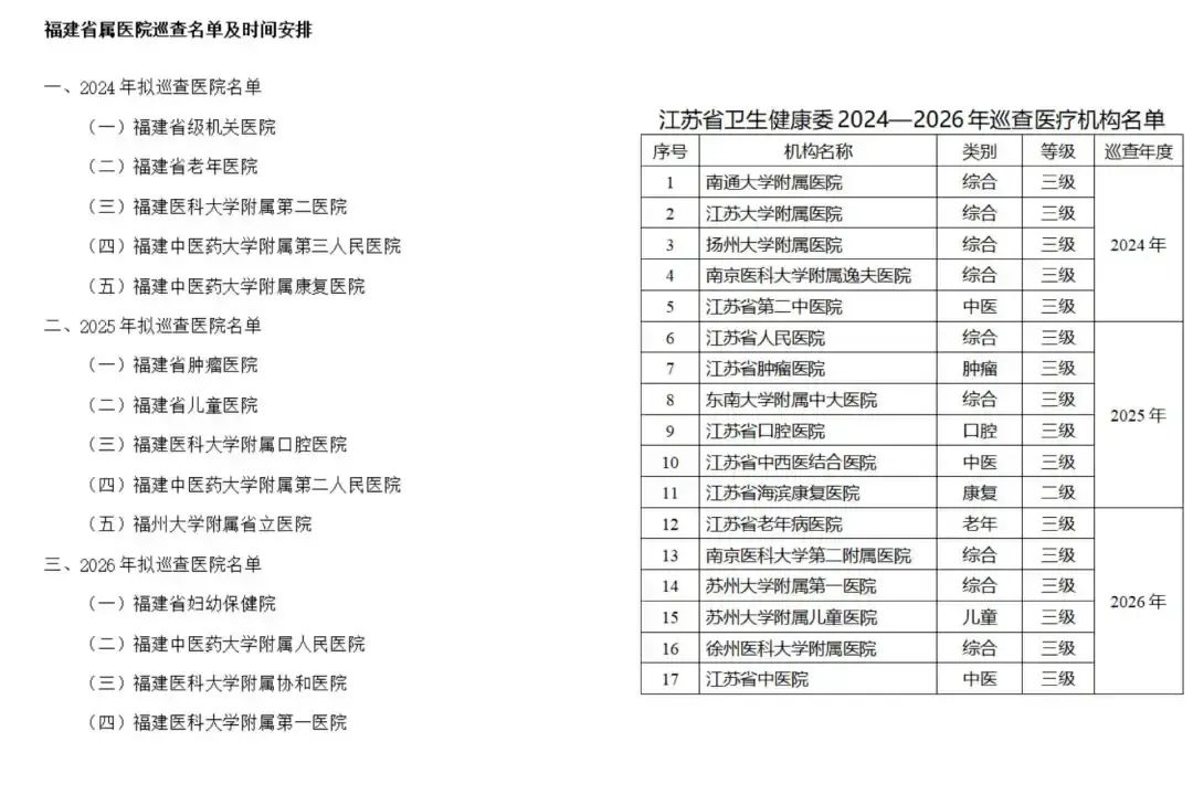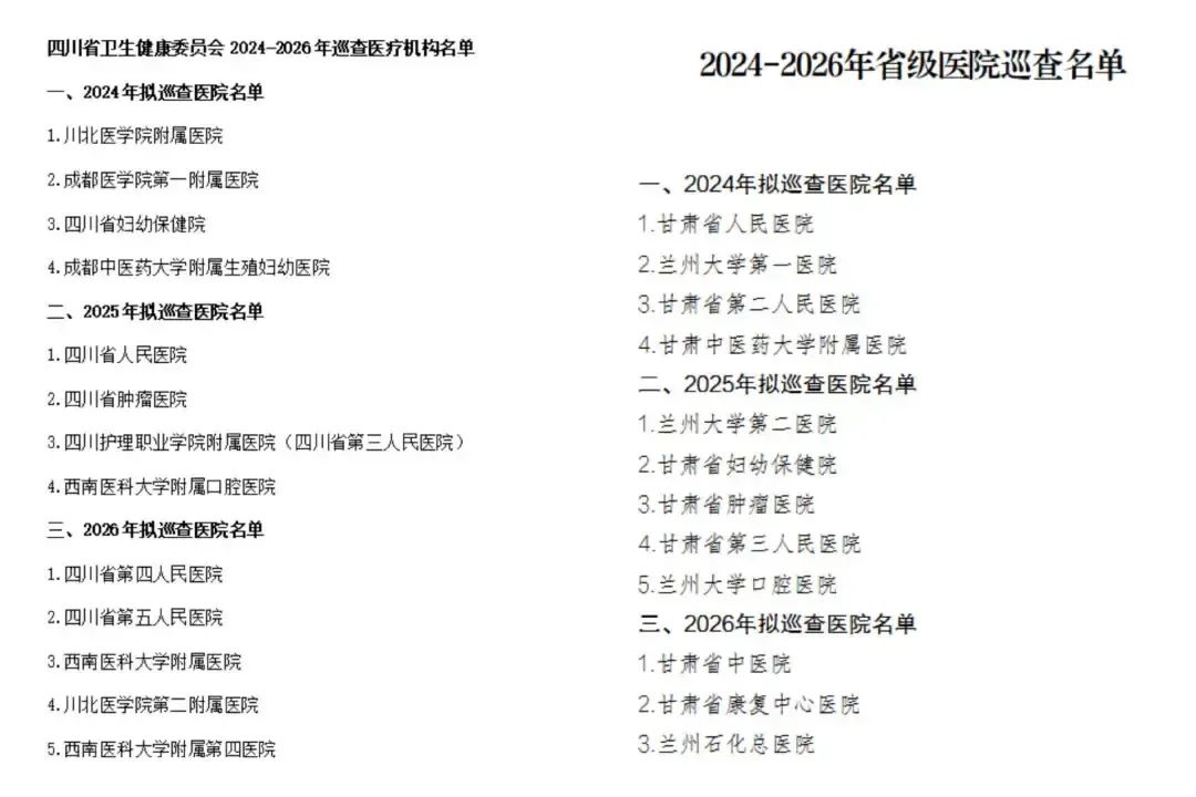 截至目前,已經有5個省份公布了將接受巡查的醫(yī)院名單,分別是四川(13家)、甘肅(12家)、黑龍江(24家)、江蘇(17家)、福建(14家)。
