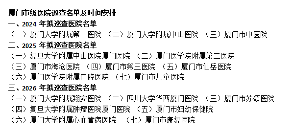 值得注意的是,廈門市公布了具體的市衛(wèi)健委巡查工作小組名單以及市級醫(yī)院巡查名單、時間安排。2024-2026年擬巡查17家大醫(yī)院,包括廈門大學附屬第一醫(yī)院、廈門大學附屬中山醫(yī)院等大三甲(詳見文末)。