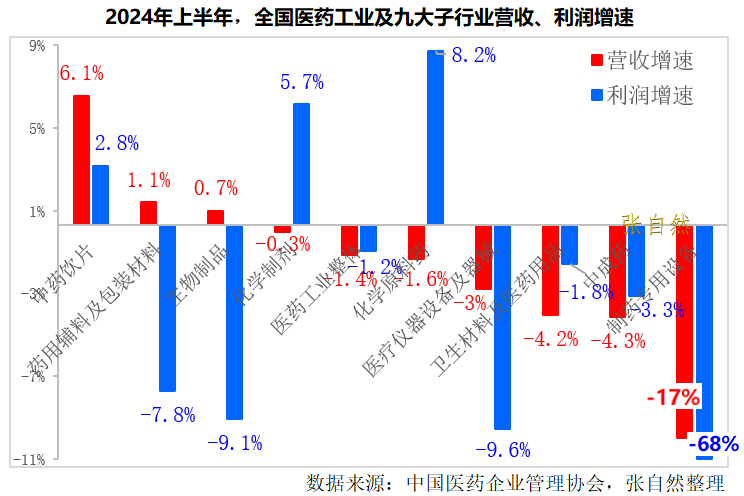 據(jù)中國醫(yī)藥企業(yè)管理協(xié)會(huì)數(shù)據(jù),2024年上半年,全國醫(yī)藥工業(yè)營收、利潤雙雙下降,分別較上年同期下降了1.4%、1.2%,增速分別低于全國工業(yè)整體增速4.3和4.7個(gè)百分點(diǎn),改變了多年來在工業(yè)領(lǐng)域領(lǐng)漲的態(tài)勢(shì)。