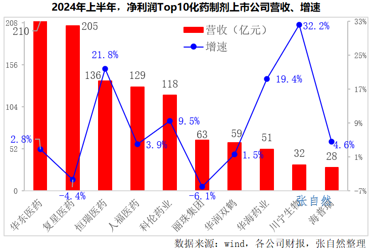 2024年上半年,在凈利潤Top10化藥制劑上市公司中,營收最大的分別是華東醫(yī)藥(209.7億元)、復(fù)星醫(yī)藥(204.6億元)、恒瑞醫(yī)藥(136億元)、人福醫(yī)藥(128.6億元)和科倫藥業(yè)(118.3億元),都已過百億;其次是麗珠集團(tuán)(62.8億元)、華潤雙鶴(59.3億元)、華海藥業(yè)(51.3億元)、川寧生物(32億元)、海普瑞(28.4億元)。