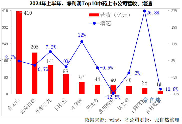 2024年上半年,在凈利潤Top10中藥上市公司中,營收最大的依次是白云山(410.4億元)、云南白藥(204.6億元)、華潤三九(141.1億元),都在百億以上。