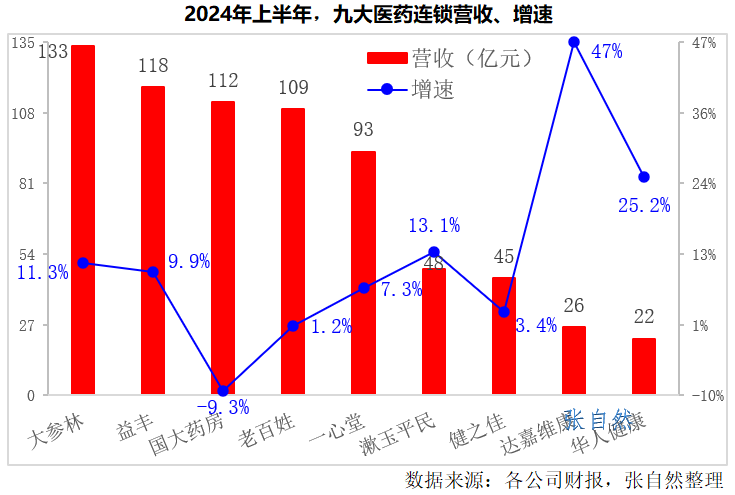2024年上半年,在9大上市醫(yī)藥連鎖企業(yè)中,營收最大的是大參林,賣了133.45億元,營收增速最快的是達(dá)嘉維康,增長了47%。